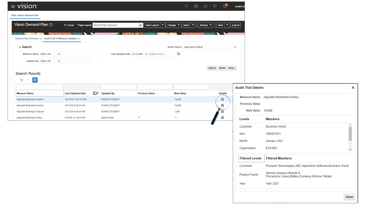 As seen in the screenshot below, one can only search by Measure, User, and Date. Only after going into the detail-record can one know the dimension values such as SKU, Customer, Month, Region.